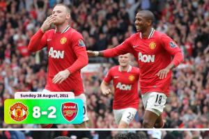 2011年8月28日23:00,2011/12赛季英超第3轮,曼联主场8-2血洗阿森纳,鲁尼戴帽,阿什利-扬梅开二度,维尔贝克、纳尼、朴智星各入一球。沃尔科特和范佩西进球为阿森纳挽回颜面。德赫亚还扑出了范佩西射出的点球。