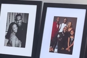 詹姆斯晒出两张家庭照的相框,分别是他和妻子的合影以及全家福,并配文道:“♾️🤎”