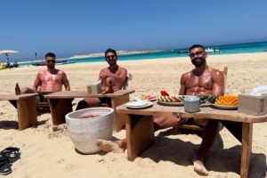 萨拉赫正在度假,他在社交媒体上晒出与朋友一起度假的照片,这位埃及前锋在海边享用沙滩水果餐。