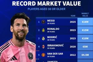 1、梅西,2025年,38岁,迈阿密国际,1800万欧