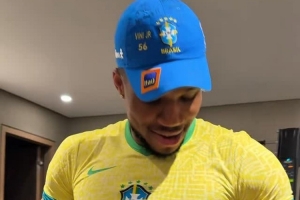 阿德托昆博社媒晒出视频,展示维尼修斯送给他的礼物,其中包括巴西队的球衣、帽子和球鞋等物品。
