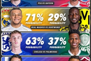 体育资讯7月2日讯 本届世俱杯8强全部产生,Score90也对8强战结果进行了概率分析,具体如下: