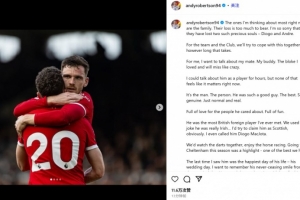 体育资讯7月4日讯 利物浦前锋若塔因车祸去世,年仅28岁。利物浦队友罗伯逊也通过社媒撰文送上悼念: