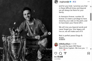 体育资讯7月4日讯 利物浦前锋若塔因车祸去世,年仅28岁。利物浦队长范迪克也通过社媒撰文送上悼念: