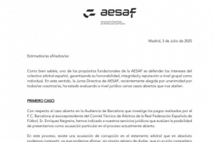 如你们所知,西班牙足球裁判协会(AESAF)的根本宗旨之一,就是维护西班牙裁判集体的利益,保障他们无论是在集体层面还是个人层面的荣誉、完整性和声誉。在此背景下,由你们全体一致选举产生的AESAF管理委员会,一直在司法层面评估几个与我们相关的悬而未决的案件。