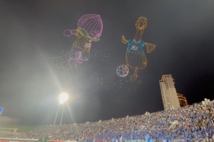 3000架无人机出现在了扬州体育公园体育场上空,组成了各种代表性的图案,为苏超联赛助兴。