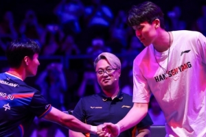 体育资讯7月11日讯 乒乓球WTT美国大满贯男单1/8决赛,中国选手王楚钦对阵韩国选手李尚洙,杨瀚森来到现场为比赛挑边。