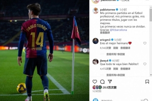 托雷社媒晒出身穿巴萨球衣的照片,并写道:“职业足球生涯首场比赛、首个进球、首个冠军,与最优秀的球员并肩作战。第一次的经历永远难以忘怀,谢谢你,巴萨。”