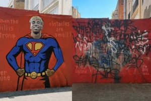 在原本的画作中,亚马尔被描绘成超人形象,胸前的S换成了L,并配有“当意志坚定时,障碍微不足道”的标语。不幸的是,位于埃斯科里亚尔街的作品现在几乎完全被黑色和白色颜料覆盖。