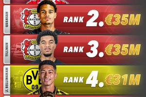 4、乔布-贝林厄姆,桑德兰→多特,3100万欧
