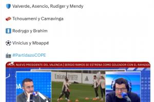 科贝电台透露皇马首发:库尔图瓦、巴尔韦德、劳尔-阿森西奥、吕迪格、门迪、琼阿梅尼、卡马文加、罗德里戈、迪亚斯、维尼修斯、姆巴佩