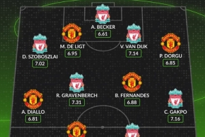 体育资讯10月19日讯 本轮英超将上演曼联与利物浦的焦点对决,数据网站Whoscored也盘点了两队球员本赛季英超场均评分最高阵容,具体如下: