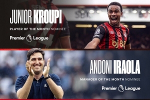 英超官方公布了10月份最佳教练、最佳球员、最佳进球的候选名单,伯恩茅斯三个奖项全部入围。
