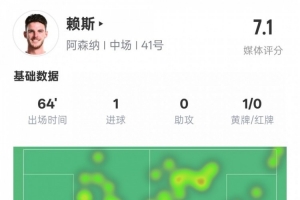 体育资讯3月13日讯 欧冠1/8决赛次回合,阿森纳主场迎战埃因霍温,赖斯首发出战,贡献1粒进球,传球成功率达到90.9%,还有2次解围,评分7.1。