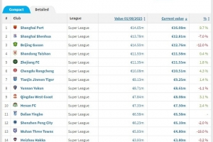 德国转会市场网2025年中超联赛身价年终例行更新今天完成
