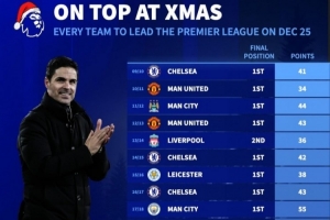 体育资讯12月19日讯 《转会市场》列出了近年英超圣诞榜首球队的积分及最终排名,近7年仅2队最终夺冠。