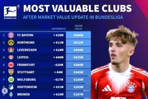 德甲球队身价榜:拜仁9.8亿断崖领跑,多特、药厂、莱比锡列前四