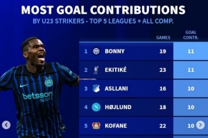 U23前锋参与进球榜:博尼、埃基蒂克11球 霍伊伦、沃尔特马德10球