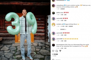 诺伊尔晒出自己手持39数字气球的照片,并配文:“这只是一个普通的数字😉非常感谢大家送上的所有生日祝福🙏🥳”