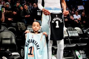 体育资讯02月25日讯 去年12月28日,马刺客场96-87击败篮网,文班亚马拿下19分7板4助6帽。赛后,文班与一名小球迷交换球衣的一幕在网络上走红。