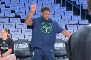 赛前,森林狼后卫安东尼-爱德华兹热身时略显轻松,投进半场三分后在场边劲舞。