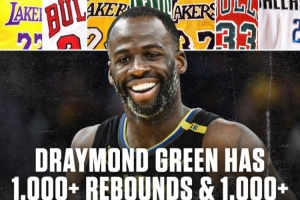 德雷蒙德-格林是历史上第8位在季后赛同时取得1000+篮板和1000+助攻的球员。